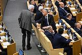Пленарное заседание Государственной думы (ГД) России. Руководитель фракции "Единая Россия" в ГД России Владимир Васильев (слева) и заместитель руководителя фракции "Единая России" в ГД России Евгений Ревенко (в центре) во время заседания.