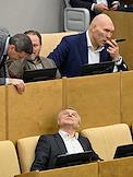 Пленарное заседание Государственной думы (ГД) России. Председатель комитета ГД России по физической культуре и спорту Олег Матыцин (слева) и член ГД России по безопасности и противодействию коррупции Динар Гильмутдинов (справа) во время заседания.