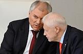 Пленарное заседание Государственной думы (ГД) России. Председатель ГД России Вячеслав Володин (слева) и председатель партии "Справедливая Россия – За Правду", руководитель фракции "Справедливая Россия – За Правду" в ГД России Сергей Миронов (справа) во время заседания.