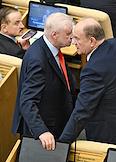 Пленарное заседание Государственной думы (ГД) России. Председатель комитета ГД России по транспорту и развитию транспортной инфраструктуры Евгений Москвичев (слева) и первый заместитель председателя комитета ГД России по региональной политике и местному самоуправлению Геннадий Панин (справа) во время заседания.