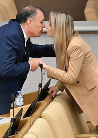 Пленарное заседание Государственной думы (ГД) России. Председатель комитета ГД России по безопасности и противодействию коррупции Василий Пискарев (слева) и заместитель председателя ГД России Анна Кузнецова (справа) перед началом заседания.