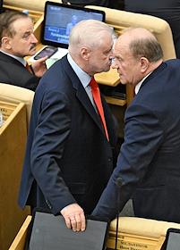 Пленарное заседание Государственной думы (ГД) России. Председатель партии "Справедливая Россия – За Правду", руководитель фракции "Справедливая Россия – За Правду" в ГД России Сергей Миронов (в центре) и председатель КПРФ, руководитель фракции КПРФ в ГД России Геннадий Зюганов (справа) во время заседания.