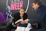 XI Международная неделя авиакосмических технологий Aerospace Science Week в Главном учебном корпусе МАИ. Директор по управлению персоналом госкорпорации "Ростех" Юлия Цветкова (слева) и директор дирекции "Цифровая, кадровая платформа" МАИ Дмитрий Житиневич (справа) во время заседания.