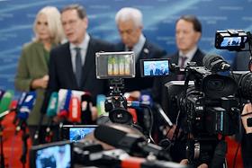 Пленарное заседание Государственной думы (ГД) России. Жанровая фотография. Камеры телеканалов во время пресс-конференции депутатов ГД России перед началом заседания.