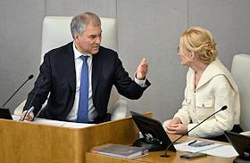 Пленарное заседание Государственной думы (ГД) России. Председатель ГД России Вячеслав Володин (слева) и его заместитель Ирина Яровая (справа) во время заседания.
