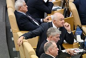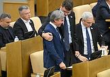 Пленарное заседание Государственной думы (ГД) России. Слева направо: заместитель председателя ГД России Борис Чернышов, председатель комитета ГД России по региональной политике и местному самоуправлению Алексей Диденко и председатель комитета ГД России по труду, социальной политике и делам ветеранов Ярослав Нилов во время заседания.