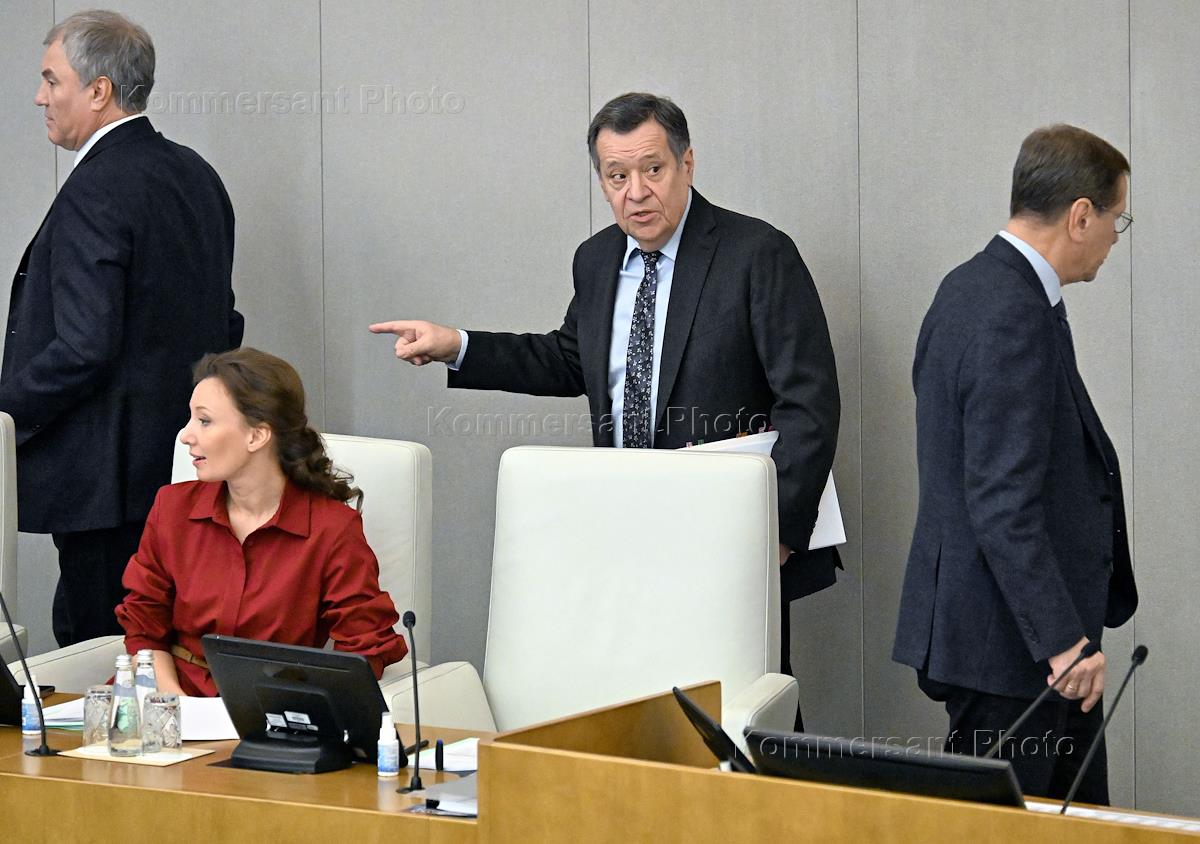 Пленарное заседание Государственной думы (ГД) России. Член комитета ГД России по безопасности и противодействию коррупции Адальби Шхагошев (в центре) и заместитель председателя ГД России Анна Кузнецова (справа) перед началом заседания.