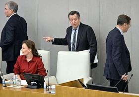 Пленарное заседание Государственной думы (ГД) России. Первый заместитель председателя комитета ГД по труду, социальной политике и делам ветеранов Николай Коломейцев (слева) и заместитель председателя ГД России Алексей Гордеев (справа) во время заседания.