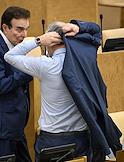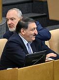 Пленарное заседание Государственной думы (ГД) России. Член комитета ГД России по промышленности и торговле Владимир Павлов (слева) и член комитета ГД России по безопасности и противодействию коррупции Абдулхаким Гаджиев (справа) во время заседания.