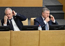 Пленарное заседание Государственной думы (ГД) России. Член комитета ГД России по развитию Дальнего Востока и Арктики Павел Симигин (слева) и член комитета ГД России по обороне Георгий Карлов (справа) во время заседания.