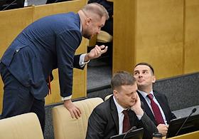 Пленарное заседание Государственной думы (ГД) России. Слева направо: заместитель председателя ГД России Владислав Даванков, председатель комитета ГД Росси по туризму и развитию туристической инфраструктуры Сангаджи Тарбаев и председатель комитета ГД России по малому и среднему предпринимательству Александр Демин во время заседания.