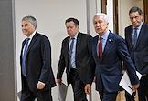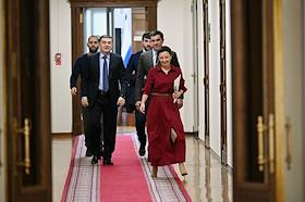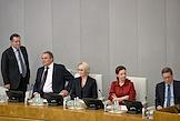 Пленарное заседание Государственной думы (ГД) России. Слева направо: заместитель председателя ГД России Алексей Гордеев, первый заместитель председателя комитета ГД России по обороне Андрей Красов, председатель комитета ГД России по просвещению Ирина Белых и первый заместитель председателя ГД России Александр Жуков перед началом заседания.