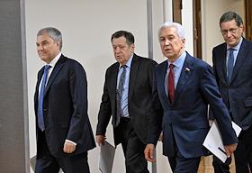 Пленарное заседание Государственной думы (ГД) России. Слева направо: председатель ГД России Вячеслав Володин, председатель комитета ГД России по бюджету и налогам Андрей Макаров, руководитель фракции "Единая Россия" в ГД России Владимир Васильев и первый заместитель председателя ГД России Александр Жуков перед началом заседания.