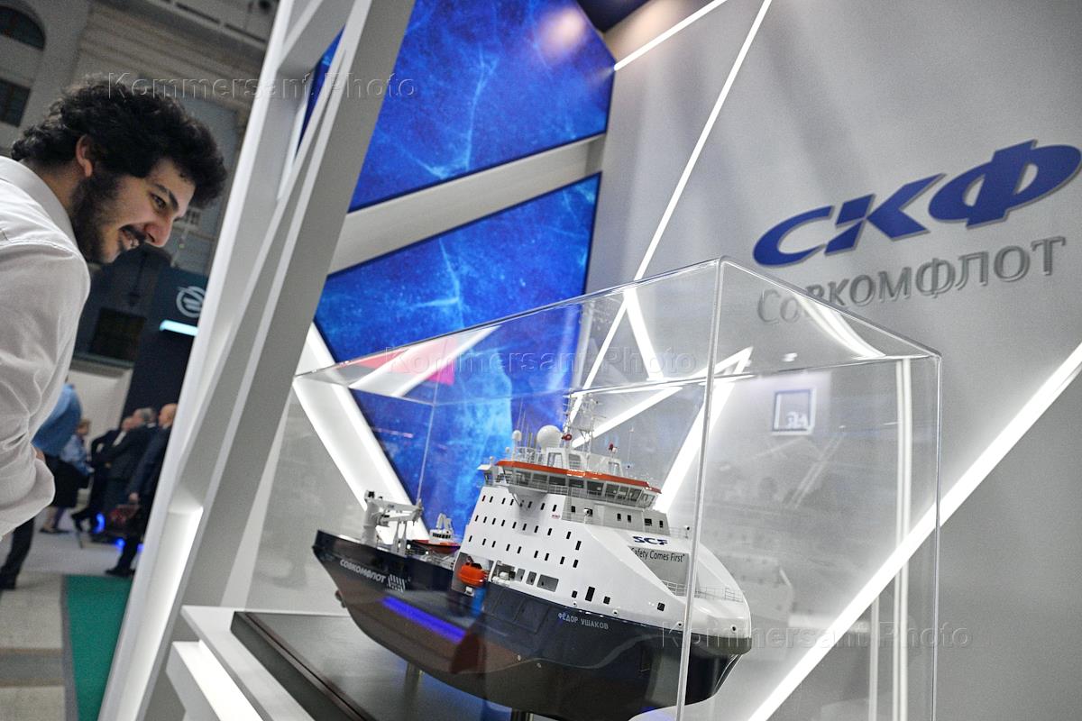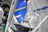 Международный форум и выставка "Транспорт России" в Московском Гостином дворе. Стенд компании "Совкомфлот" (СКФ) и макет корабля на выставке.