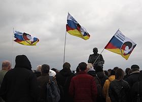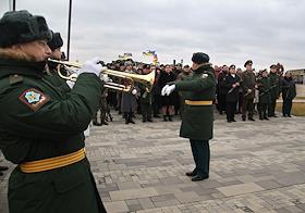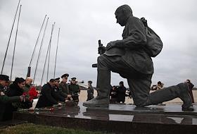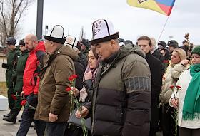 IV International Forum "Peacemaking of Generations in the Historical Memory of the Russian State". Forum participants during the flower-laying ceremony at the Monument to the Soviet Soldier on the territory of the Sambek Heights museum complex of the Great Patriotic War.