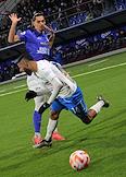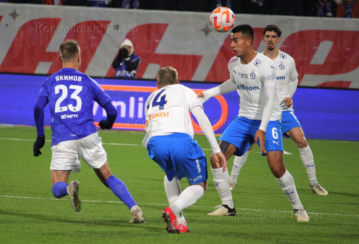 Мир Российская Премьер-Лига (РПЛ) 2024/2025. 16-й тур. Матч между командами "Факел" (Воронеж) - "Динамо" (Москва) на стадионе "Факел". Игрок команды "Динамо" Артур Гомес (слева) и игрок команды "Факел" Макс Дзиов (справа) во время матча.