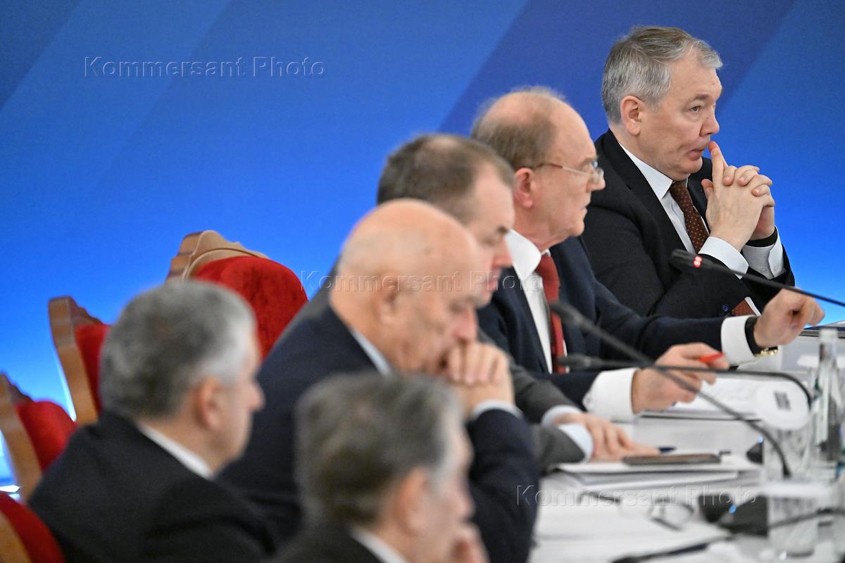V Международная конференция "Роль взаимодействия фракций политических партий и блоков в межпарламентском сотрудничестве стран СНГ" в Колонном зале Дома Союзов. Руководитель фракции "Единая Россия" в Государственной думе (ГД) России Владимир Васильев (в центре) во время конференции.