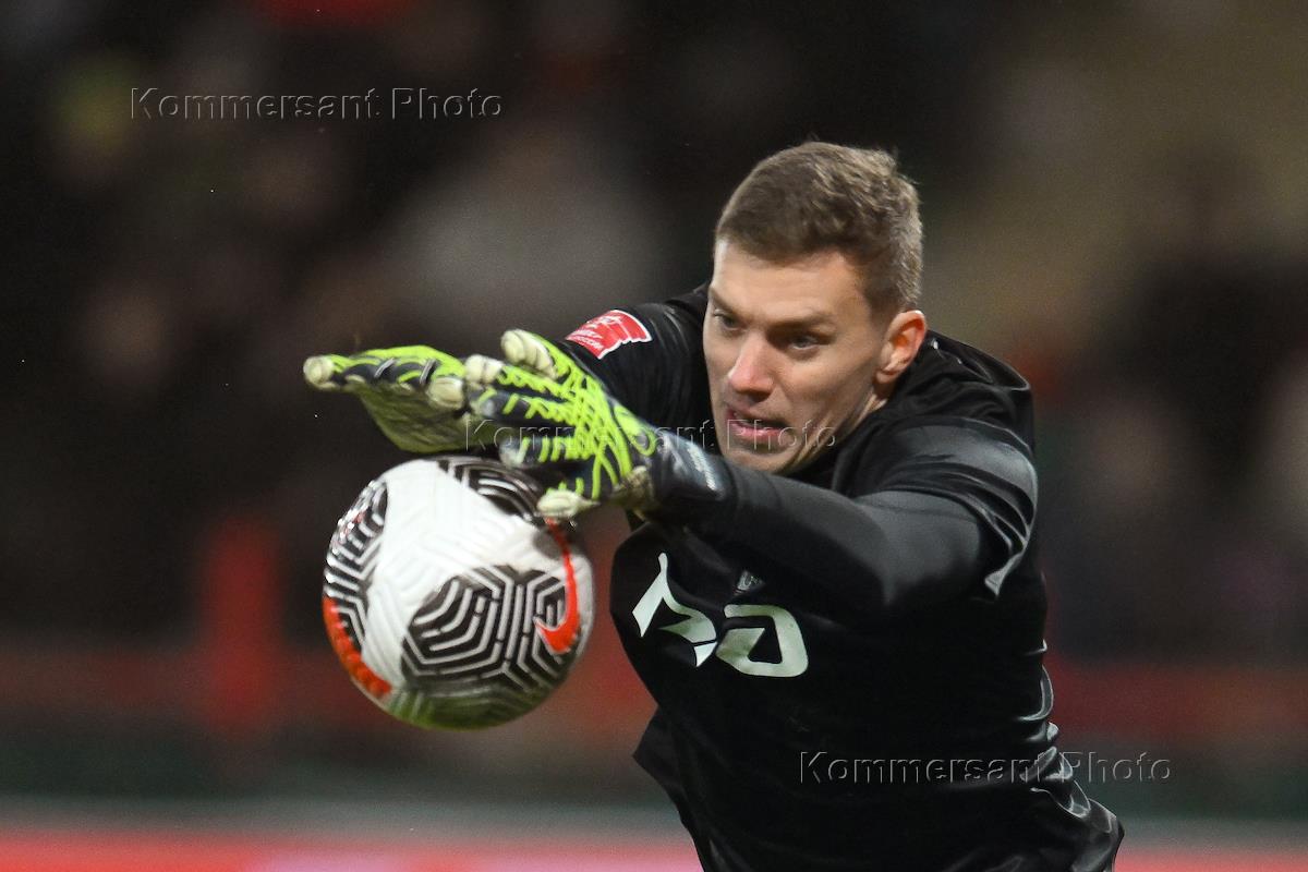 Фонбет - Кубок России по футболу 2024/25. 1/4 финала. Матч между командами "Локомотив" (Москва) - "Динамо" (Москва) на стадионе "РЖД Арена". Вратарь команды "Локомотив" Антон Митрюшкин во время матча.