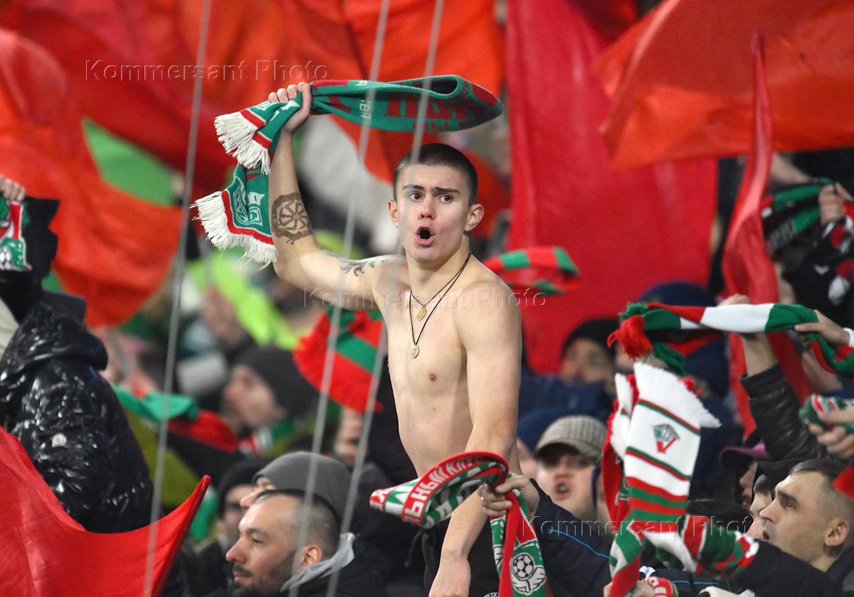 Фонбет - Кубок России по футболу 2024/25. 1/4 финала. Матч между командами "Локомотив" (Москва) - "Динамо" (Москва) на стадионе "РЖД Арена". Болельщики команды "Локомотив" на зрительской трибуне во время матча.