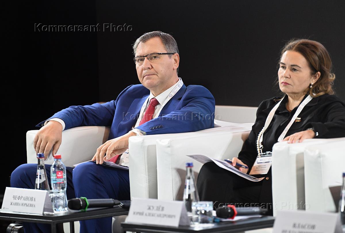 XV Всероссийский конгресс пациентов "Вектор развития: пациент-ориентированное здравоохранение" в отеле "Азимут Отель Олимпик". Пленарное заседание. Президент Всероссийского союза страховщиков Евгений Уфимцев (слева) и представитель в Совете Федерации России исполнительный орган государственной власти Белгородской области Жанна Чефранова (справа) во время заседания.