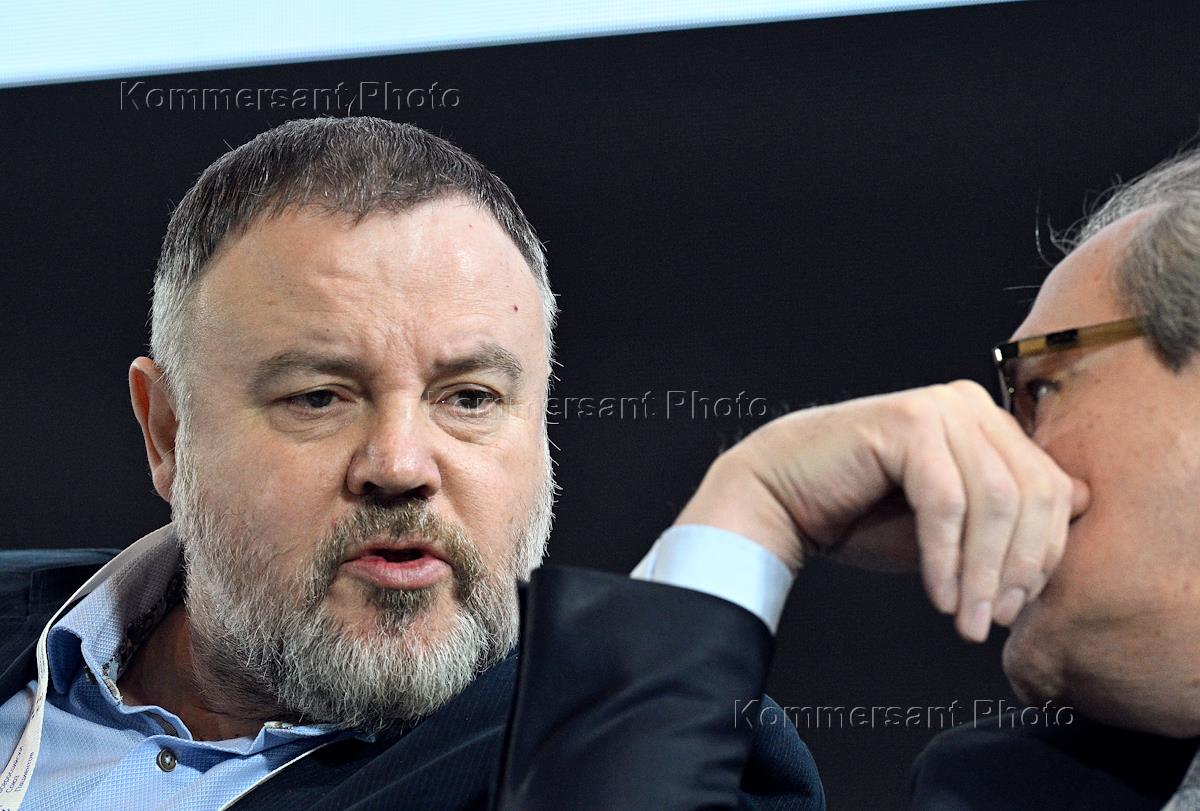 XV Всероссийский конгресс пациентов "Вектор развития: пациент-ориентированное здравоохранение" в отеле "Азимут Отель Олимпик". Пленарное заседание. Сопредседатель Всероссийского союза общественных объединений пациентов Ян Власов (слева) и советник президента России, председатель Совета по развитию гражданского общества и правам человека при президенте России Валерий Фадеев (справа) во время заседания.