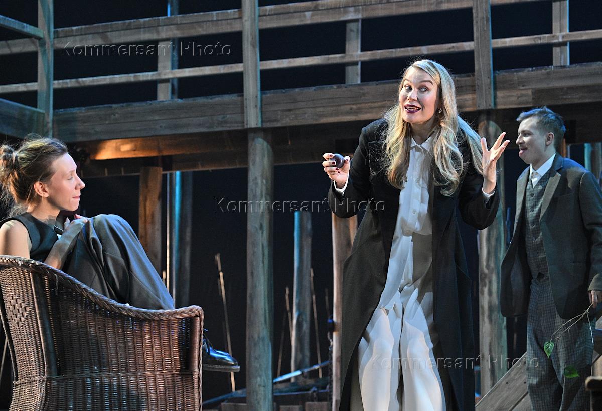 Пресс-показ спектакля "Чайка" по одноименной пьесе А.П. Чехова в постановке художественного руководителя Московского художественного театра (МХТ) имени А.П. Чехова Константина Хабенского на сцене МХТ имени А.П. Чехова. Актеры Андрей Максимов (в центре) и Кристина Бабушкина (справа) во время спектакля.
