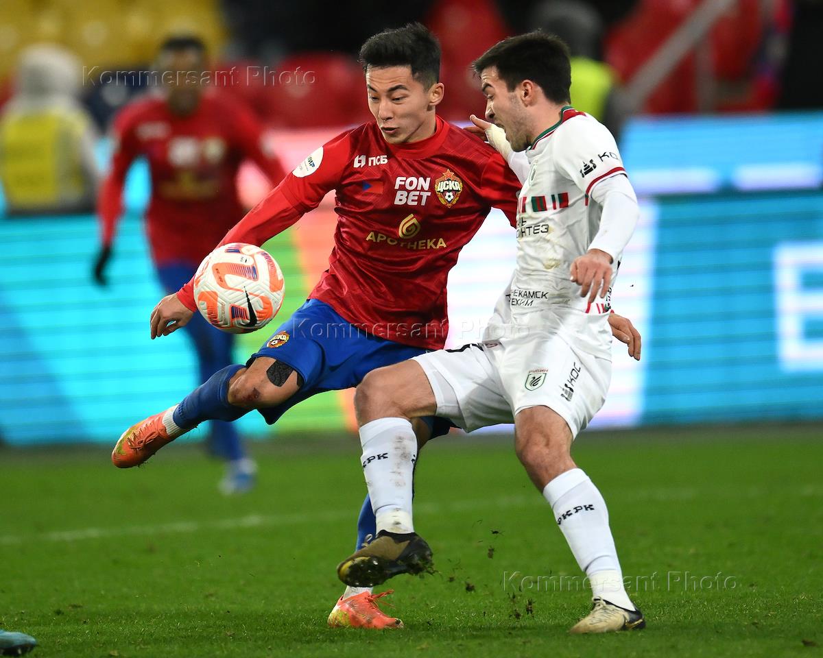 Мир Российская Премьер-Лига (РПЛ) 2024/2025. 17-й тур. Матч между командами ЦСКА (Москва) - "Рубин" (Казань) на стадионе "ВЭБ Арена". Игрок команды ЦСКА Аббосбек Файзуллаев (слева) и игрок команды "Рубин" Руслан Безруков (справа) во время матча.