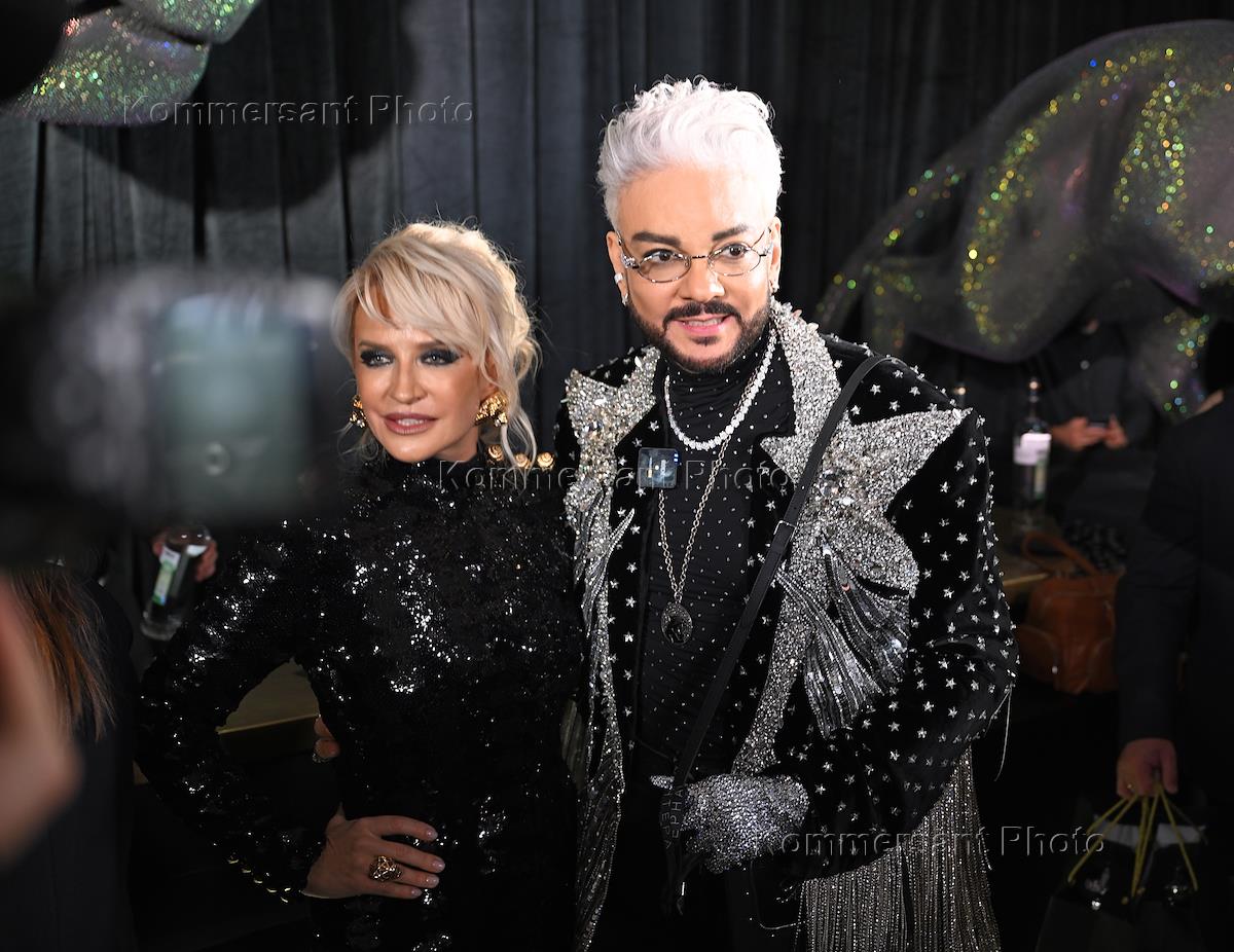 Premiere of singer Philip Kirkorov's video "Black Panther" at the Khudozhestvenny cinema. The wife of the CEO of the Ritual.ru company Oleg Shelyagov Victoria Shelyagova (left) and singer Philip Kirkorov (right) at the premiere.