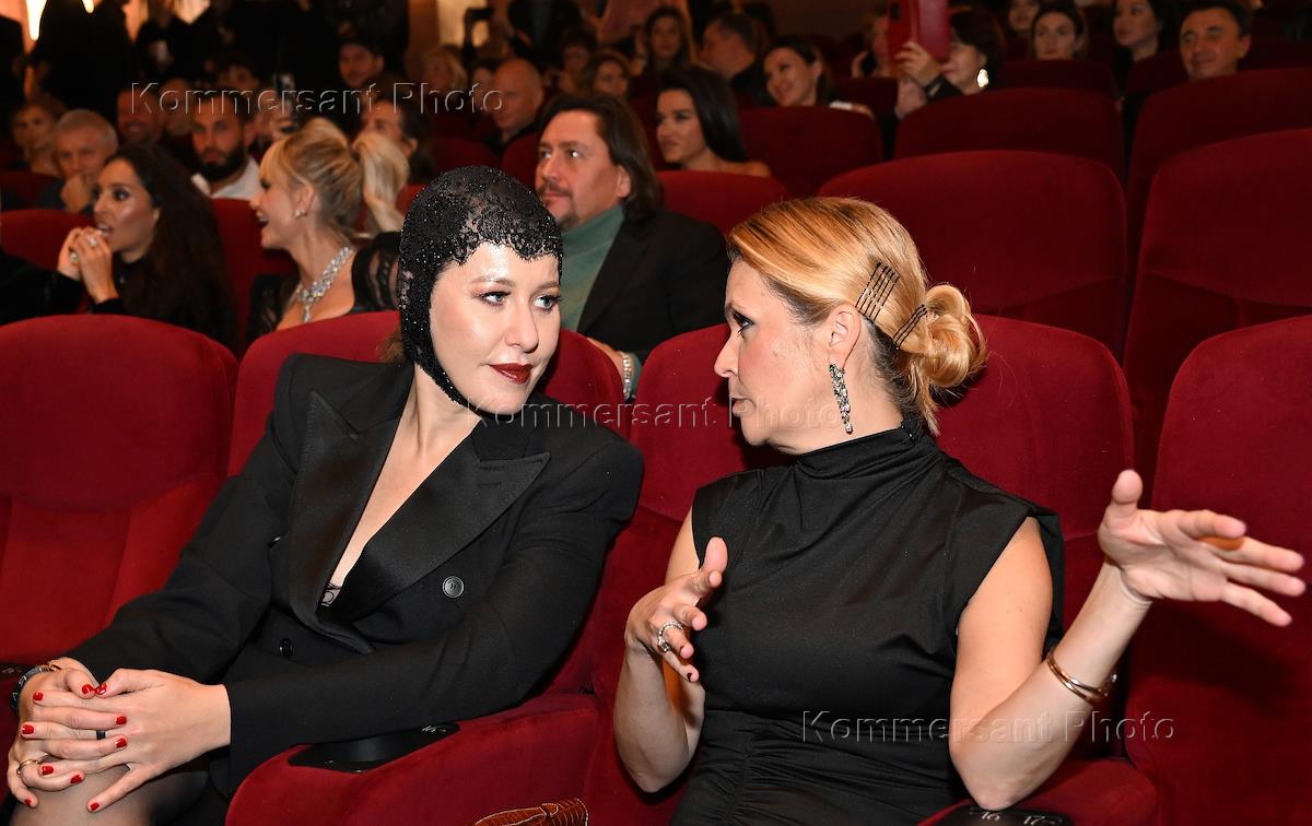 Премьера клипа певца Филиппа Киркорова "Черная пантера" в кинотеатре "Художественный". Телеведущая, певица Ольга Бузова (справа) и журналист, телеведущая, основатель Фонда развития моды Москвы Ксения Собчак (слева) на премьере.