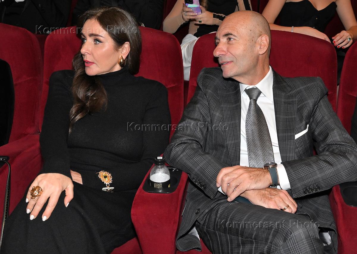 Премьера клипа певца Филиппа Киркорова "Черная пантера" в кинотеатре "Художественный". Композитор Игорь Крутой (справа) и его супруга Ольга Крутая (слева) на премьере.