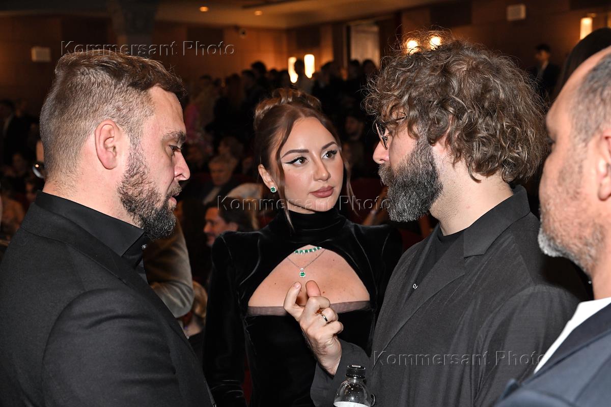 Premiere of singer Philip Kirkorov's video "Black Panther" at the Khudozhestvenny cinema. Entrepreneur Mikhail Gutseriev (right) and TV presenter, singer Olga Buzova (left) at the premiere.