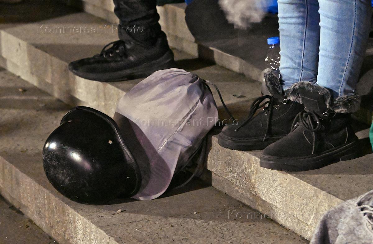 The situation in Tbilisi. A protest rally outside the Georgian Parliament building against the authorities' decision to abandon negotiations on joining the European Union. Genre photography. A protective helmet lies on the steps of the building at the feet of the protesters.
