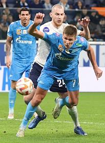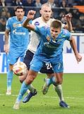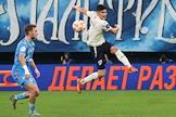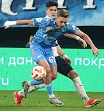 World Russian Premier League (RPL) 2024/2025. 17th round. Match between the teams “Zenit” (St. Petersburg) - “Krylia Sovetov” (Samara) at the Gazprom Arena stadium. Zenit team player Alexander Sobolev (right) and Krylia Sovetov team player Roman Evgeniev (center) during the match.