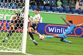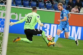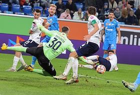 World Russian Premier League (RPL) 2024/2025. 17th round. Match between the teams "Zenit" (St. Petersburg) - "Krylia Sovetov" (Samara) at the Gazprom Arena stadium. Goalkeeper of the Krylia Sovetov team Sergei Pesyakov (center) during the match.