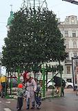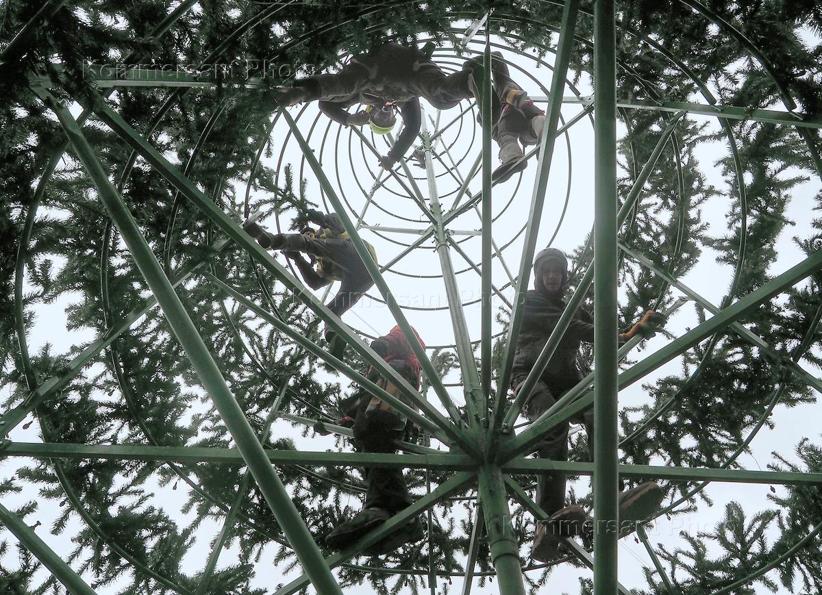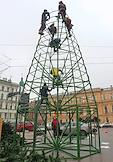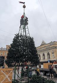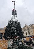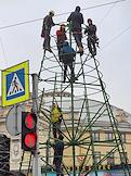 Подготовка к празднованию Нового года в городе. Установка и монтаж искусственной новогодней елки на площади Белинского перед зданием цирка Чинизелли.