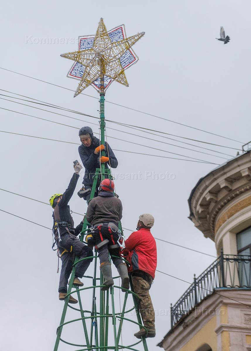Preparations for the New Year celebration in the city. Installation and installation of an artificial New Year tree near the Vasileostrovskaya metro station.