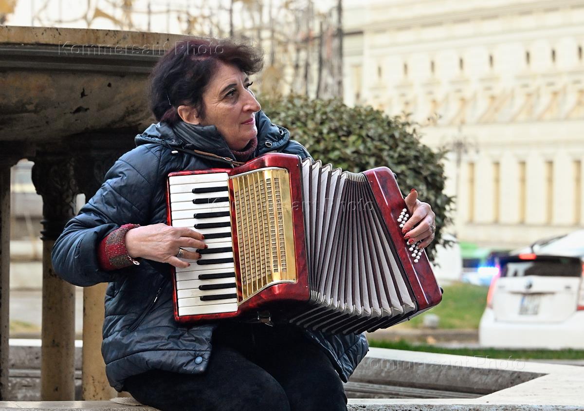 The situation in Tbilisi. Genre photography. A woman plays the accordion on a city street.