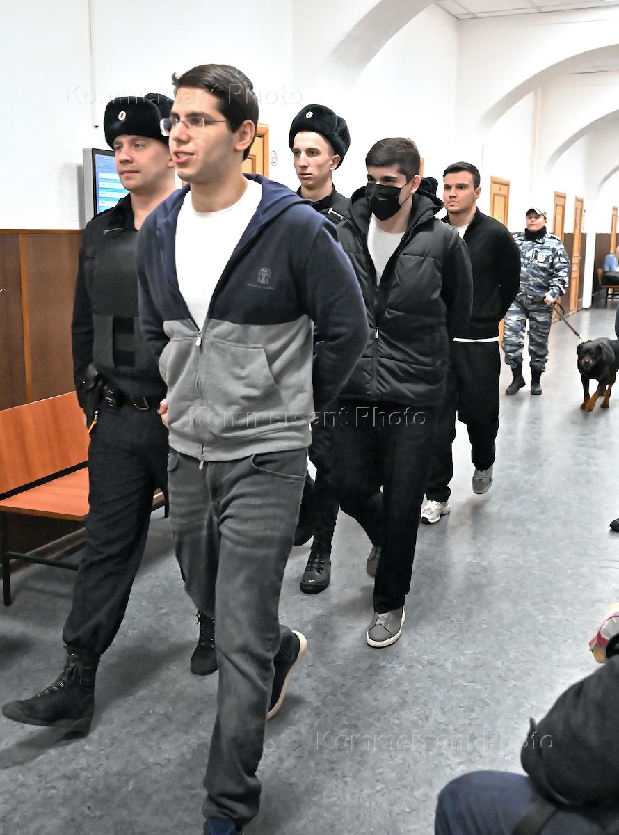 Оглашение приговора по делу в отношении Виктора Якубова, Эмиля Гурбанова и Ильи Сафонова, обвиняемых в хищении в особо крупных размерах в рамках программы "Пушкинская карта", в Басманном районном суде. Слева направо: обвиняемые Виктор Якубов, Илья Сафонов и Эмиль Гурбанов перед началом заседания суда.