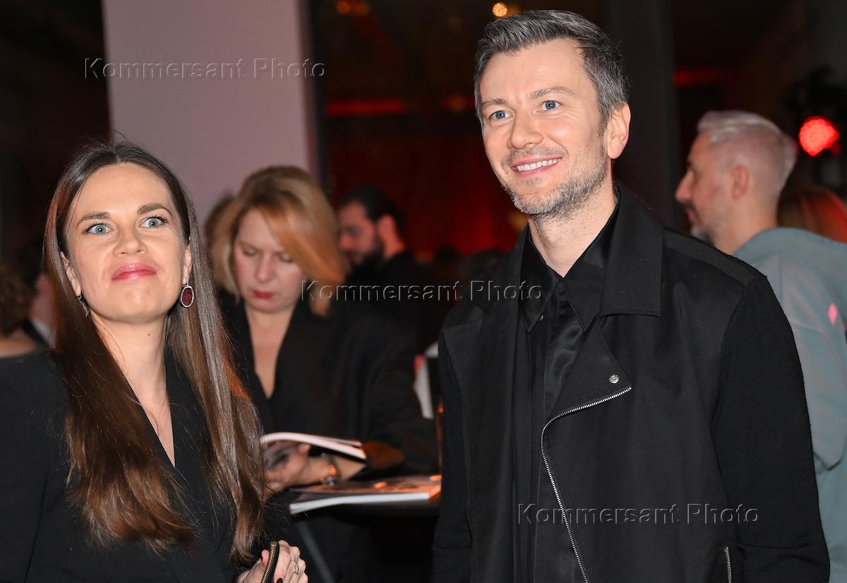 Презентация нового авторского проекта писателя Сергея Минаева "Чтиво" в Галерея на Серебрянической набережной. Писатель Сергей Минаев и соосновательница телеграмм-канала "Антиглянец" Юлия Пош на презентации.