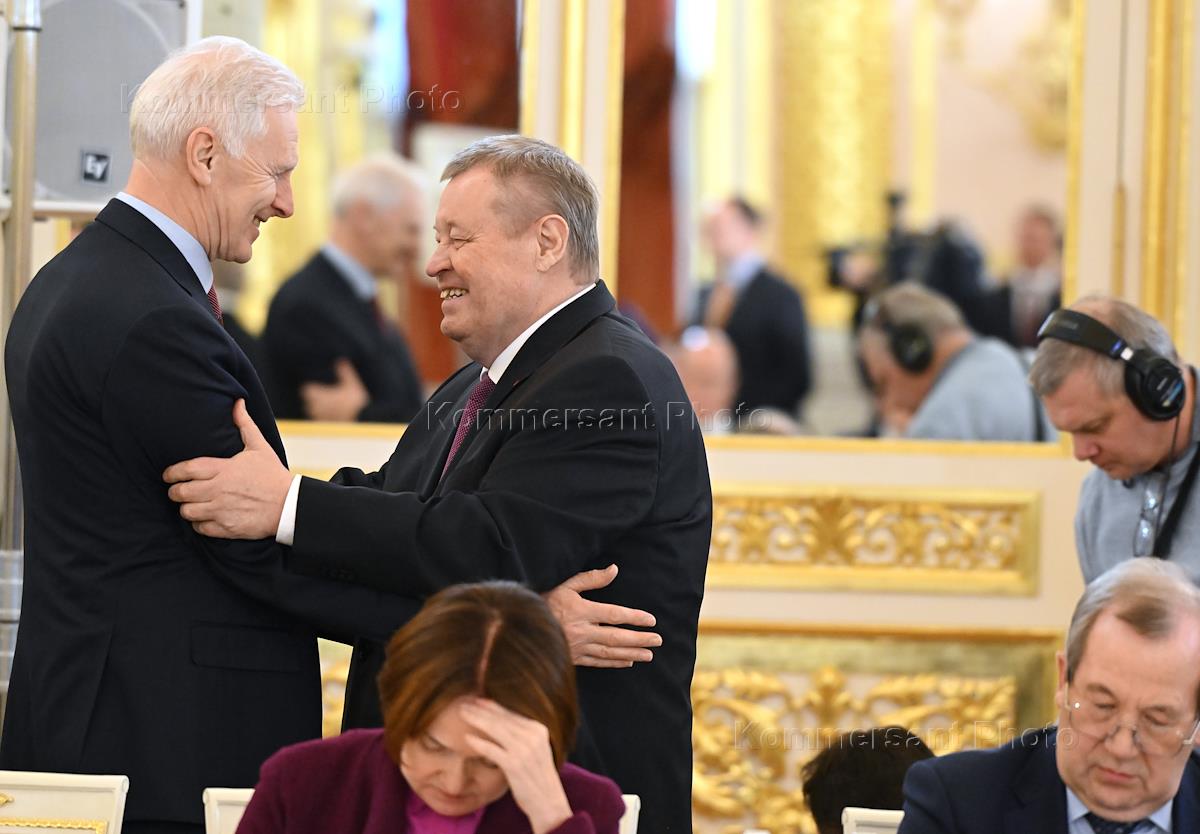 Meeting of the Council for Strategic Development and National Projects in the Kremlin. Aide to the President of Russia Andrei Fursenko (left) and Plenipotentiary Representative of the President of Russia in the Southern Federal District (SFD) Vladimir Ustinov (center) before the start of the meeting.