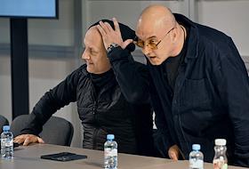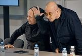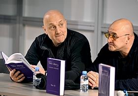 Международная ярмаркa интеллектуальной литературы "non/fictioN №26" в Гостином дворе. Презентация поэтического сборника Павла Шубина, подготовленного издательской группой "КПД". Писатель Захар Прилепин (слева) и критик Алексей Колобродов (справа) во время презентации.
