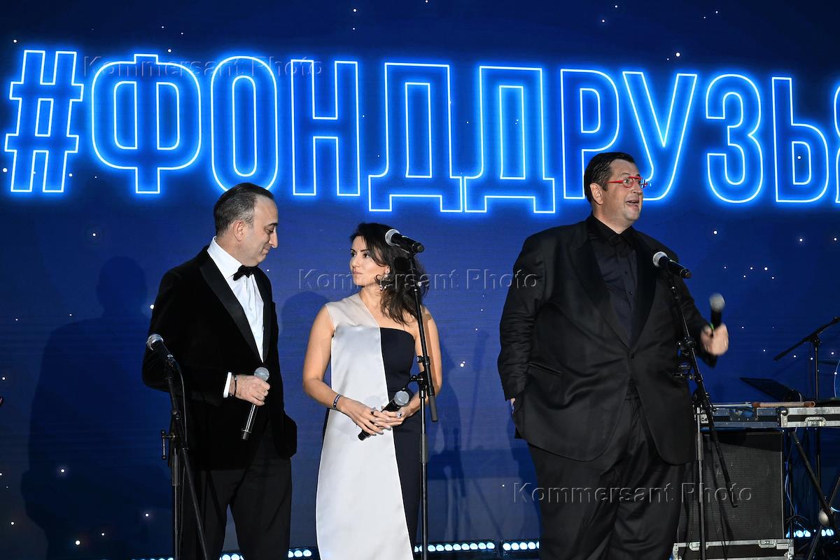 Christmas tree of the Friends charity foundation "Just Space" at The Carlton Moscow hotel. From left to right: co-founders of the Friends charity foundation Gor Nahapetyan, Oksana Razumova and Yan Yanovsky at the Christmas tree.