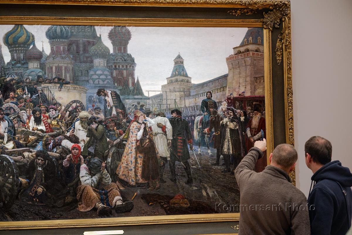 Exhibition "Itinerants" dedicated to the 150th anniversary of the association of Peredvizhniki artists in the new building of the State Tretyakov Gallery on Kadashevskaya embankment. Visitors at the exhibition.
