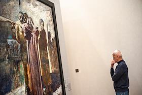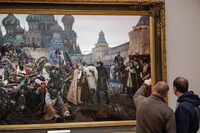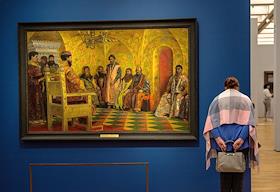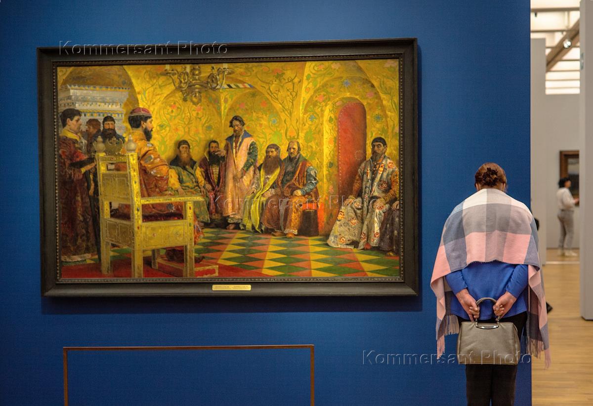 Exhibition "Itinerants" dedicated to the 150th anniversary of the association of Peredvizhniki artists in the new building of the State Tretyakov Gallery on Kadashevskaya embankment. Visitors at the exhibition.