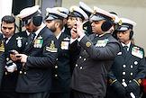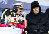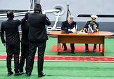Церемония передачи АО "Рособоронэкспорт" ВМС Индии фрегата проекта 11356 Tushil ("Тушил") на заводе Объединенной судостроительной корпорации "Янтарь". Министр обороны Индии Раджнатх Сингх (справа) и начальник Штаба ВМС Индии, адмирал Динеш Трипати (слева) во время церемонии.