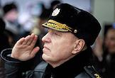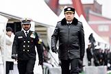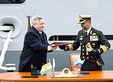 Церемония передачи АО "Рособоронэкспорт" ВМС Индии фрегата проекта 11356 Tushil ("Тушил") на заводе Объединенной судостроительной корпорации "Янтарь". Главнокомандующий Военно-морским флотом России, адмирал Александр Моисеев (справа) во время церемонии.