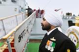 Церемония передачи АО "Рособоронэкспорт" ВМС Индии фрегата проекта 11356 Tushil ("Тушил") на заводе Объединенной судостроительной корпорации "Янтарь". Командир индийского экипажа фрегата Tushil коммодор Питер Варгиз (справа) во время церемонии.