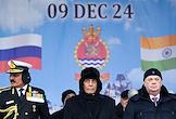 Церемония передачи АО "Рособоронэкспорт" ВМС Индии фрегата проекта 11356 Tushil ("Тушил") на заводе Объединенной судостроительной корпорации "Янтарь". Слева направо: начальник Штаба ВМС Индии, адмирал Динеш Трипати, министр обороны Индии Раджнатх Сингх и директор Федеральной службы по военно-техническому сотрудничеству Дмитрий Шугаев во время церемонии.