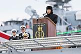 Церемония передачи АО "Рособоронэкспорт" ВМС Индии фрегата проекта 11356 Tushil ("Тушил") на заводе Объединенной судостроительной корпорации "Янтарь". Министр обороны Индии Раджнатх Сингх во время церемонии.