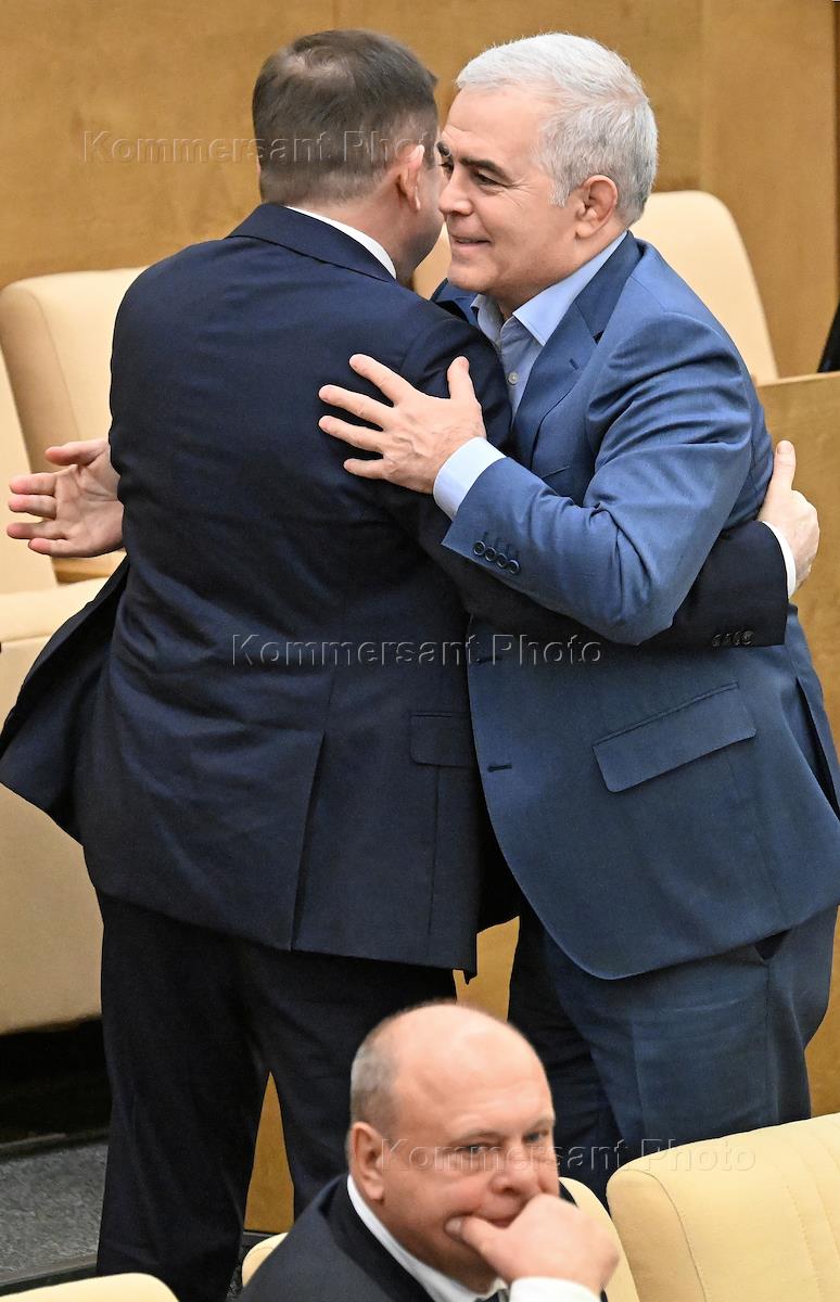 Пленарное заседание Государственной Думы (ГД)России. Председатель комитета ГД России по обороне Андрей Картаполов (слева) и председатель комитета ГД Росси по туризму и развитию туристической инфраструктуры Сангаджи Тарбаев (справа) во время заседания.